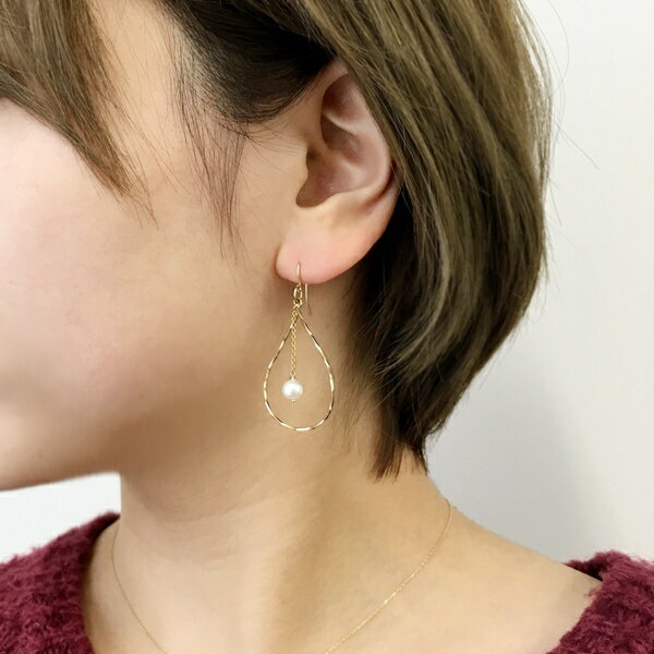 テイクアップ ピュアのシャープシズクパールピアス角ばったテクスチャーをつけた線材をしずく型にまとめて、中央にタンスイパールを揺らしました。