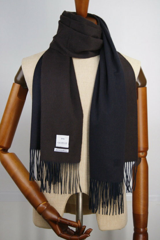 フェアファクス・コレクティブ HPより抜粋) カフリンクス/ラペルピン/タイクリップ/ポケットチーフ/ベルト/FAIRFAXタイ/FAIRFAXシャツ ブランドFAIRFAX(フェアファクス)幅約40cm長さ約180(フリンジ含む)cmベースカラーダークブラウン×ネイビー素材カシミア100%商品特徴使い勝手の良いソリッドのリバーシブルマフラー。