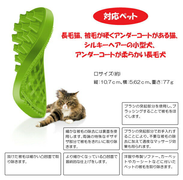 長毛猫、被毛が硬くアンダーコートがある猫や、シルキーヘアーの小型犬、アンダーコートが柔らかい長毛犬 にオススメです! 商品詳細 サイズ 約H10.7cm x W5.62cm 重さ 77g 素材 シリコン100% 原産国 スイス 対応犬 長毛猫、被毛が硬くアンダーコートがある猫や、シルキーヘアーの小型犬、アンダーコートが柔らかい長毛犬